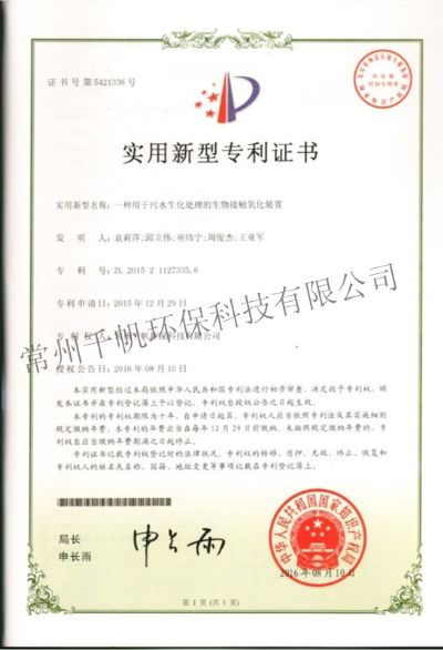 實(shí)用新型專利證書(shū) 一種用于污水生化處理的生物接觸氧化裝置