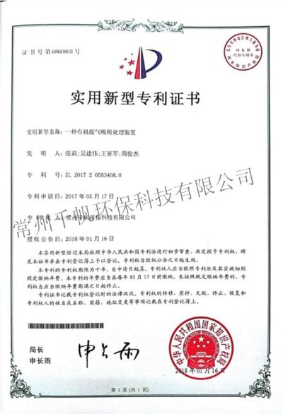 實(shí)用新型專利證書(shū) 一種有機(jī)廢氣吸附處理裝置