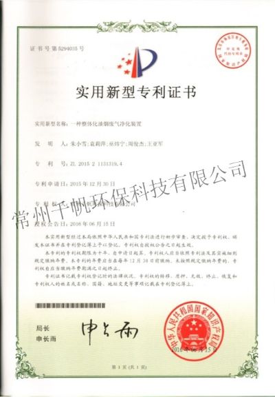 實(shí)用新型專利證書(shū) 一種整體化油煙廢氣凈化裝置