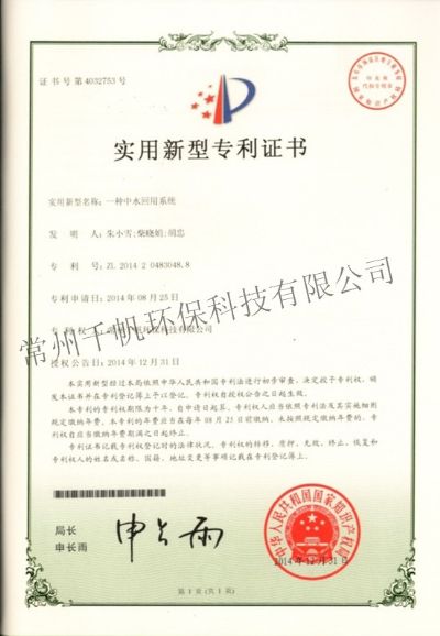 實(shí)用新型專利證書(shū) 一種中水回用系統(tǒng)