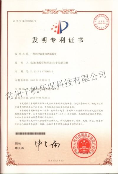 發(fā)明專利證書(shū) 一種預(yù)埋管維修堵漏裝置