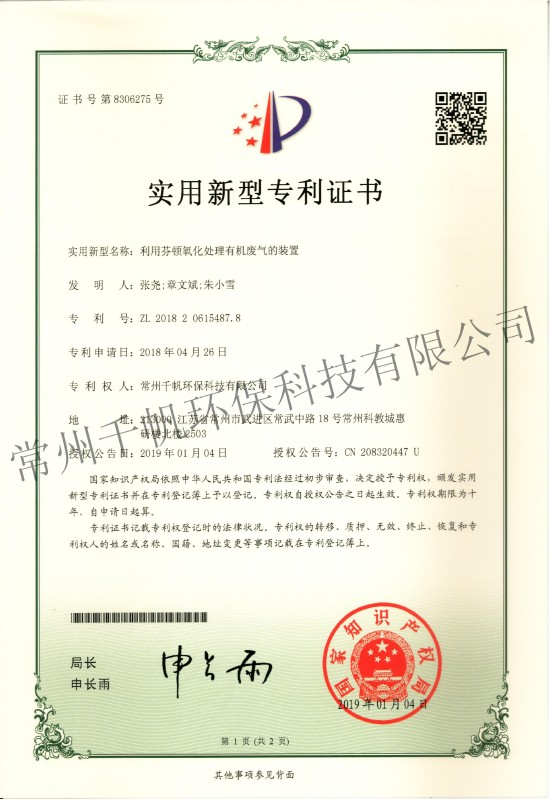 實(shí)用新型專利證書(shū) 利用芬頓氧化處理有機(jī)廢氣的裝置