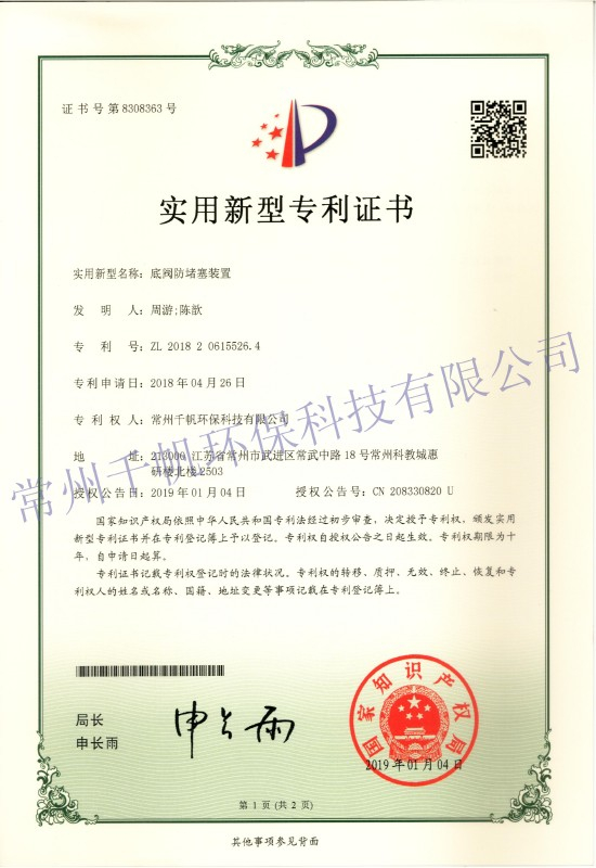 實(shí)用新型專利證書(shū) 底閥防堵塞裝置