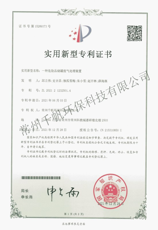 實(shí)用新型專利證書(shū) 一種危險(xiǎn)品儲(chǔ)罐廢氣處理裝置