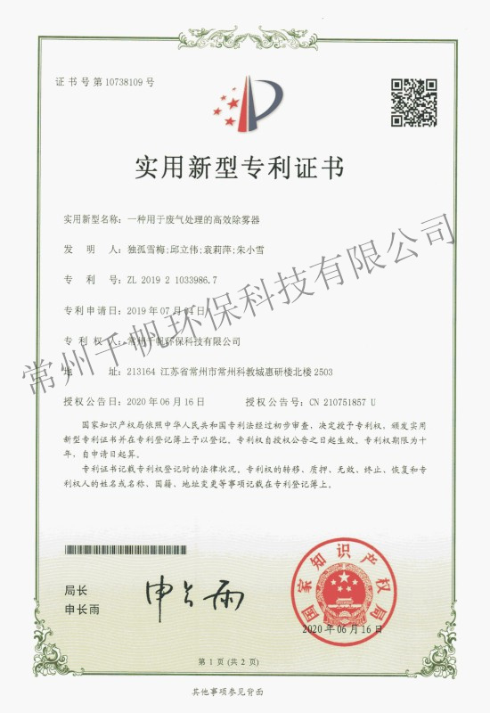 實(shí)用新型專利證書(shū) 一種用于廢氣處理的高效除霧器