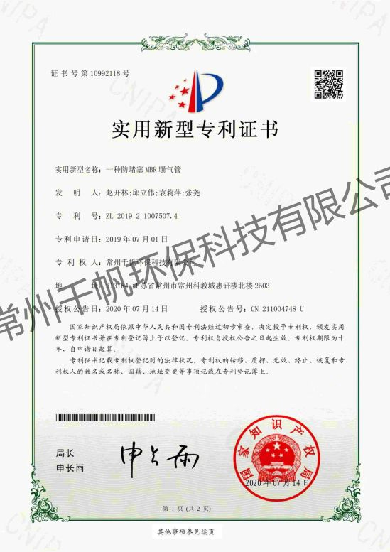 實(shí)用新型專利證書(shū) 一種防堵塞MBR曝氣管