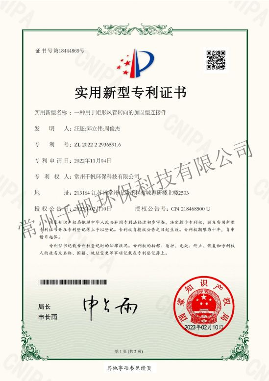 實(shí)用新型專利證書(shū) 一種用于矩形風(fēng)管轉(zhuǎn)向的加固型連接件